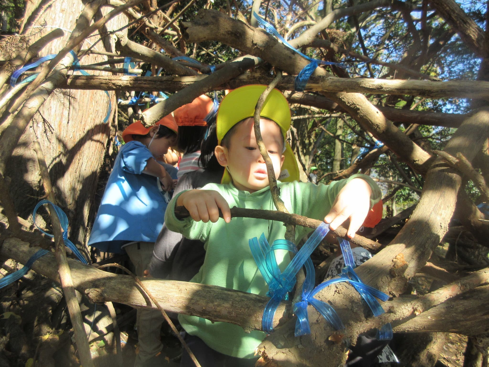 裏山を活用し、週に1回自然保育活動を行っています。山の活動で得られる柔軟な四肢の動きを重視し、身体の成長、体力の向上を目指します。また、もう一つのあそびの環境と位置づけ、遊びの経験を広げていきます。